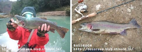 2008年初釣りは ニジマスの管理釣り場から。 下の魚は当日の最大 47cmでした。 雨の後みたいに白濁していて、底の方に反応が集中していました。 当日のタックル Rod:TRS60UL Reel:アルテグラ2500 Line:フロロ4lb Lure:プリズナー この魚の他にも沢山釣れて、午前中のみで11匹でした。